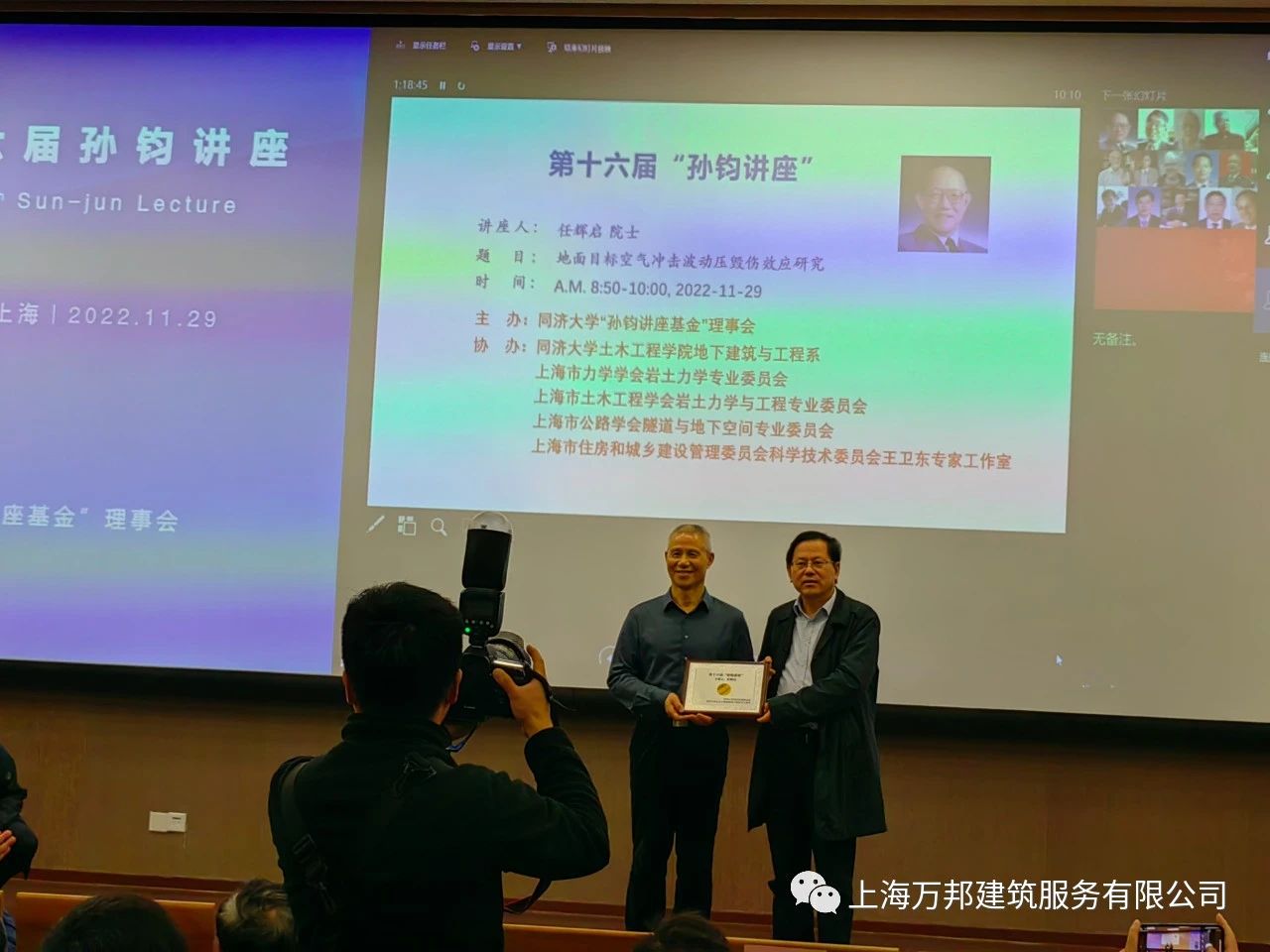 上海万邦建筑服务有限公司应承办方城地建设集团有限公司、华建集团上海地下空间与工程设计研究院之邀请,于2022 年 11 月 29 日在上海同济大学建筑设计研究院参加行业专家与学者进行专题演讲与研讨会议,我公司有关人员应邀适时参与。